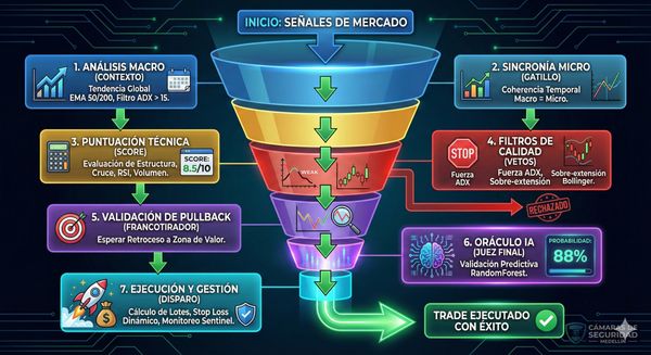 Nuestro sistema no "adivina" el mercado; lo filtra. A través de nuestro exclusivo "Embudo de 7 Capas", el bot descarta el ruido y solo ejecuta operaciones donde la probabilidad matemática y la Inteligencia Artificial coinciden.